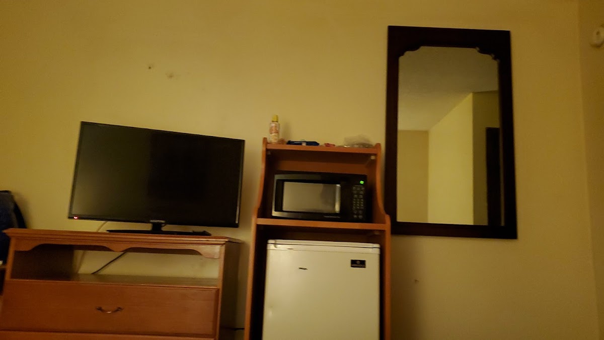 Very clean and also smelled fresh and clean, (considering the intense cleaning spots on carpet from pet accidents, but odor free) Very well lit up outside. TV worked well along with the heat , A/C unit., on this cool damp and rainy night. Shower/ tub was clean and the water was hot. The wi fi worked well and the management was friendly. Sign outside office door said mask required, which is understandable as the office check in area is small. All in all with the easy on and off of I-95 and adjacent to gas station/ convenience store with beer cave make this motor lodge worth staying at. We stayed with our 2 small dogs and the pet charge was fair and respectfully understood as their was no pet dander present , (until we left). My wife is a retired maid for a white glove cleaning service and said is was only worth 3 1/2 stars as the wall edges had dust and need to be vacuumed with an edge attachment and the high part of the mirror was smudged